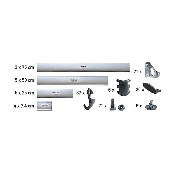 By combining the aluminum strips with the supplied corner joints and 90 degrees - solutions can be implemented. The tabs only be plugged into the profile and secured with enclosed plastic pins. The wall brackets are bolted to the profile and must (not included) to be fixed to the wall with suitable fastening materials. The kit consists of the following aluminum strips 3 x 75 cm, 5 x 50 cm, 5 x 25 cm, 4 x 7.4 cm. 37 Garderobenhaken, 21 Wall holder 6 corner joints, end caps 20, mounting material for the wall brackets to the aluminum profiles and for the coat hook. Similar to picture.
