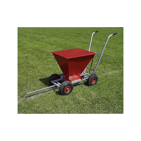 Abstellschieber with vibrating screen. Quality red powder coating. Adjustable spreading width 5 cm cm to 12th Four large balloon wheels, each 260 x 85 mm. By finding device. Adjustable guide rails. Recommended Streumaterial: sports ground chalk. Dimensions (L x W x H): 97 x 53 x 66 cm. Empty weight: 28 kg, capacity: 50 liters.