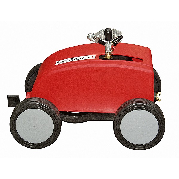 The RollcarT-V-3 drives and rains independently. For use on large green areas and sports facilities. After opening the water tap, the RollcarT-V-3 pulls itself over the area to be watered on the previously laid nylon rope. The speed is infinitely variable from 10 - 20 m/hour. At the end of the area, the RollcarT-V automatically turns off the water and stops the irrigation. The water-carrying hose with a diameter of 1 inch and a length of at least 60 metres (for sports facilities) is pulled behind. The hose is not included in the scope of delivery.