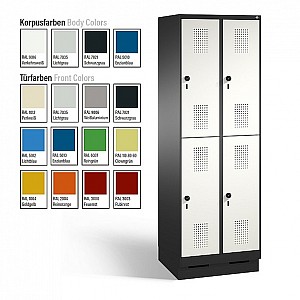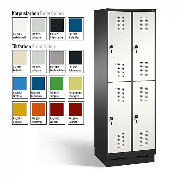 Double-decker locker series EVOLO high to 100 mm base, height 1800 mm, depth 500 mm, doors made of sheet steel. 2 compartment widths available.