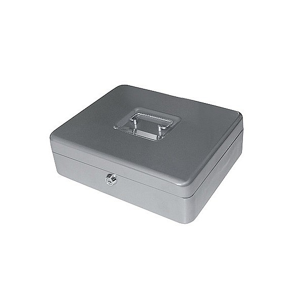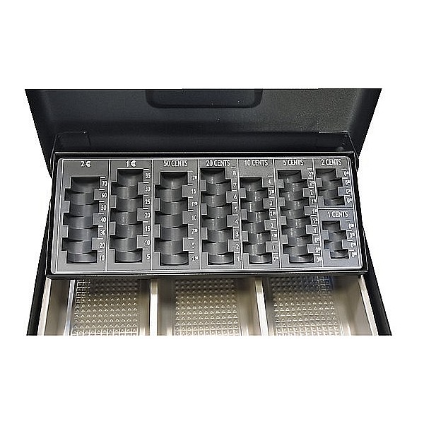 Money counting cassette made of sheet steel with counting board. The removable coin insert slides back automatically when the lid is opened. The cassette is equipped with a carrying handle that can be retracted into the lid.