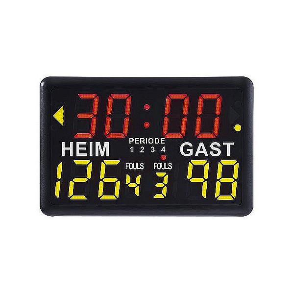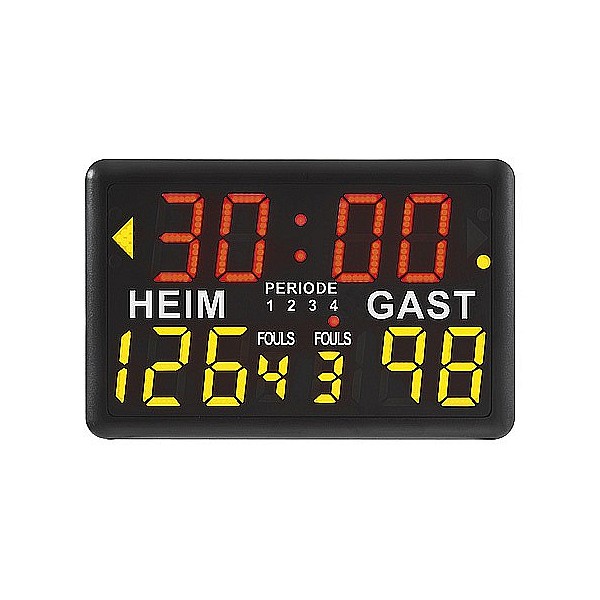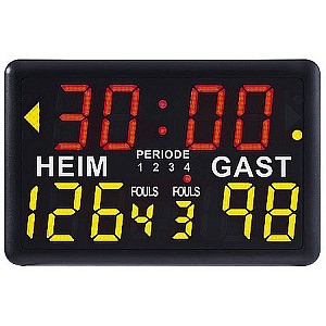 For mobile use as a desktop unit or as a stand optional display to the chassis. With integrated control panel for nine preprogrammed sports, badminton, basketball, boxing, handball, judo, karate, wrestling, table tennis and volleyball. Digits height 120/110 / 70mm, for a recommended sight of 30m max. 60m. Function Display of: Score, Result, playing time, playing period, Team fouls counter, set / game + right to serve. Acoustic signal (horn, automatic / manual), adjustable volume. Supply voltage: 230V Weight: 7kg.