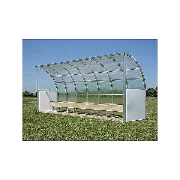 Elegant aluminum construction. The round roof shape makes it an eye-catcher for every sports field. Side parts made of acrylic glass at the top, white plastic sheets at the bottom. Roof made of polycarbonate double wall sheets, UV-resistant. The scope of delivery includes a bench and a slatted frame made of wood as well as 4 ground anchors for a secure stand. Height 206 cm, depth 120 cm.