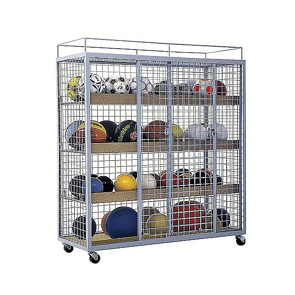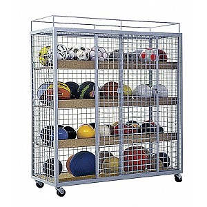 Painted, both sliding doors lockable, incl. Cylinder lock. 3 pieces adjustable wooden shelves, movable by means of castors 4, the above continuous rail for e.g. Pezzibälle. Dimensions (W x H x D): 150 x 150 x 60 cm. Delivery in assembled state.