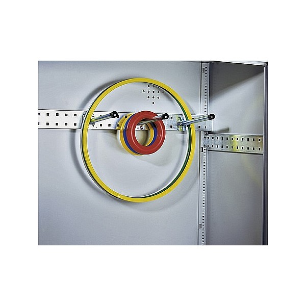 Rear wall to traverse module sports equipment cabinet vertically and horizontally adjustable, for individual fitting e.g. with tire holder. Supplied without hooks and holders.