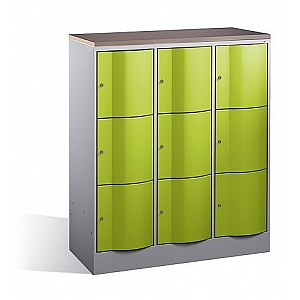 Special school locker 3 compartments, 3 compartments überereinander. 100 mm high black base. Each door with cylinder lock and 2 keys. Special doors of 1.5 mm sheet steel, with curvature to the front. With ventilation openings in the rear wall and 18 mm wall spacers.