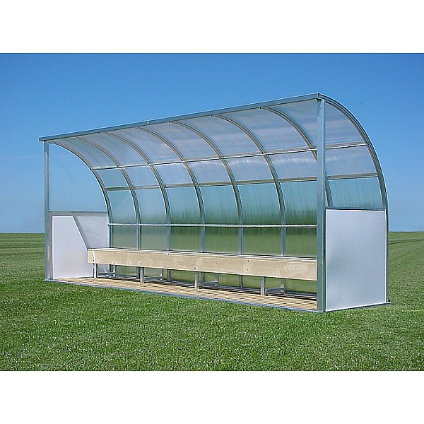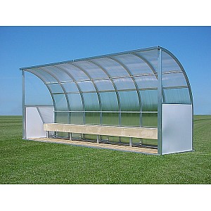 The EUROPA coach and player booths are made of very stable materials and are an eye-catcher for every sports field. They are available for 6, 8, 10 or 13 people. With red plastic seats or a bench made of wood - with polycarbonate or acrylic glass panel. The side and back panels provide enough space for sponsors prints and advertising. Execution: 10 people (images dressing rooms for 13 people) Dimensions: 5.00 x 2.06 x 1.25 m Players cabins offer the following advantages: Elegant arc shape on a sturdy aluminum base frame wood floor grate Stable benches made of wood planks or comfortable plastic seat shells resistant pane of polycarbonate sheets or clear acrylic panels The discs are weather resistant and can be replaced individually Absolutely