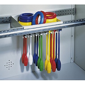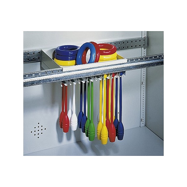 The tray with integral leg retainer is positioned on the longitudinal beams and is vertically and horizontally adjustable individually. To module sports equipment cabinet 5580th
