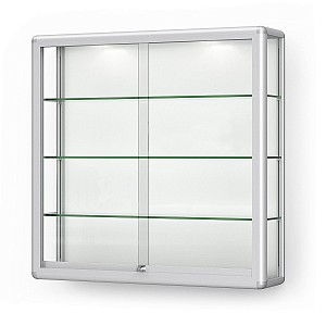 The flexible, robust wall display cases are made of torsion-resistant, silver anodized, rounded aluminum profiles with round corner connectors. The load capacity of the continuously adjustable glass shelves is 12 kg, which also makes it possible to display heavier exhibits. The display cases have a magnetic back panel. The two-part sliding glass doors with roller bearings are made of ESG safety glass and have a push cylinder safety lock. Delivery freight collect ex works.