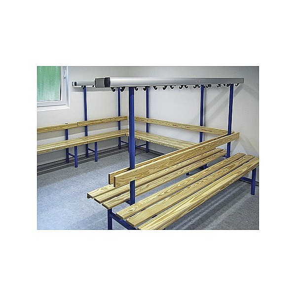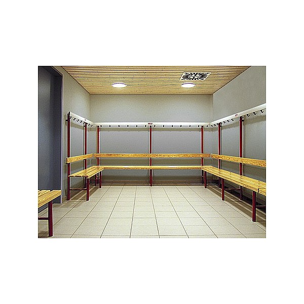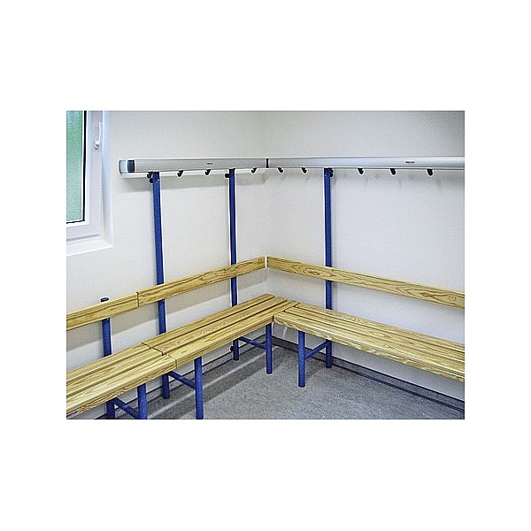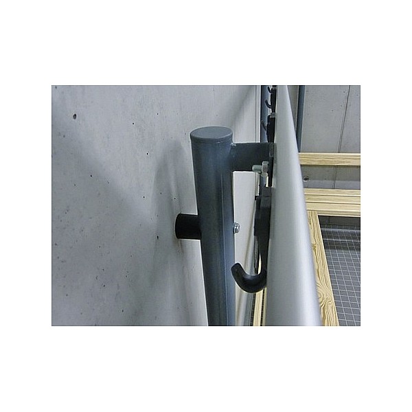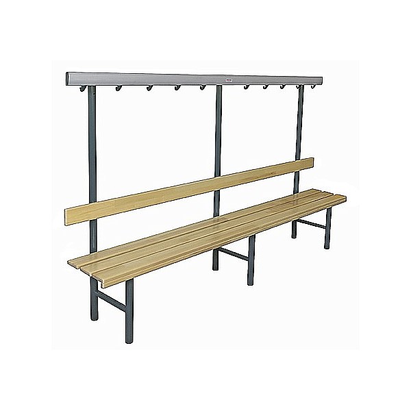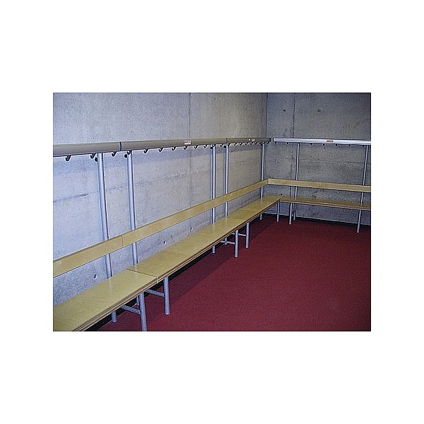 In good wood aluminum steel structure. The feet are made of precision round steel tube and by default painted blue gray RAL 7031st For soil conservation feet with PVC-gliders are provided. The anodized aluminum profile hook bars are fitted with unbreakable plastic hooks or with shapely stainless steel double hook, about 5 pieces per meter. The hooks are attached according to the safety of the BUK. Seat and back strips are painted solid wood colorless. The front support rail is additionally equipped with an attached cover strip. On one side, for wall mounting, height 45 cm, width 40 cm, total height of 152 cm, each seat 3 and strips 1 back strip. per cm