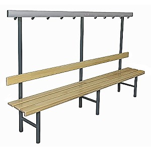 In good wood aluminum steel structure. The feet are made of precision round steel tube and by default painted blue gray RAL 7031st For soil conservation feet with PVC-gliders are provided. The anodized aluminum profile hook bars are fitted with unbreakable plastic hooks or with shapely stainless steel double hook, about 5 pieces per meter. The hooks are attached according to the safety of the BUK. Seat and back strips are painted solid wood colorless. The front support rail is additionally equipped with an attached cover strip. On one side, for wall mounting, height 45 cm, width 40 cm, total height of 152 cm, each seat 3 and strips 1 back strip.