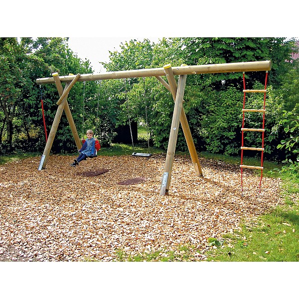 Bock swing cm with pole shoes of round wood Ø 14, cpl. with ball-bearing hooks and 2 safety swing seats, incl. with a double-sided cantilever climbing rope and a rope ladder. Pivot height: 2.5 m. Stand post at the head ends with plastic caps. 4 segment pole shoes made of galvanized steel to avoid direct contact with the ground of the housing uprights. Delivery ex works without construction. For truck unloading 2 helpers are needed.