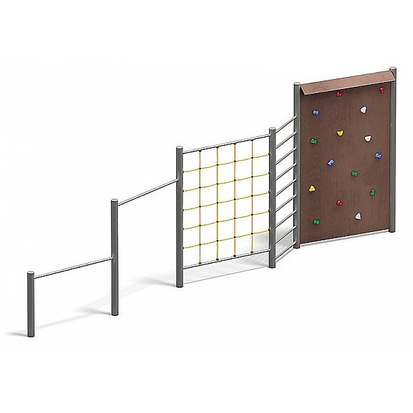 Turn-climbing combination, (L x B x T) 6.89 x 1.31 x 2.60 m, 475 kg, metal, 1 x Freeclimbing wall (2-climbable side), 1 x wall bars (stainless steel), 1 x climbing net (Stahltau), 2 x triangle (stainless steel)