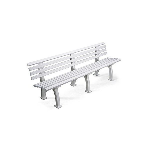 150 cm long, white. 2 plastic legs and 5 multi-chamber plastic slats, without back - thus useful both sides. High seating comfort, weight about 12 kg.
