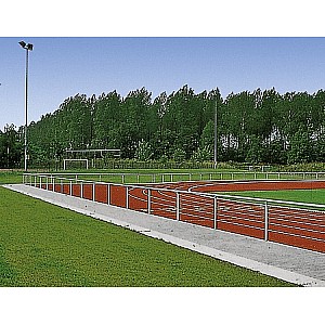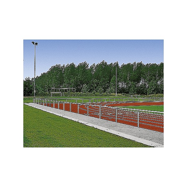 Consisting of anodized matt silver from a maintenance-free, aluminum-tube 60 x 2.5 mm for handrail and standpipe. Parts are simply plugged together with T-die cast parts and fixed in concrete, the standpipe. Easy assembly. Handrail height 110 cm from upper edge of ground. Complete with mounting hardware.