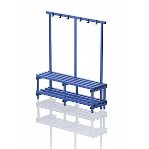 Wardrobe bench plastic, one-sided, cm 200x45x170, JUNIOR, 5 seat profiles, for wet areas, with coat hooks and storage compartment for shoes and bags. The PVC material ensures a high load capacity and durability, is easy to clean and meets the current standard of hygiene. Delivery is partially assembled. Unfree ex works.
