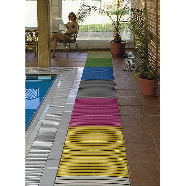 Baths mat 60 cm wide of impact-resistant PVC welded construction, easy to set up and unrolled. By simply spraying water to clean it, is non-slip on the floor is not slippery. For rooms of all kinds, on moist soil, for baths, washing facilities, changing rooms etc. Athlete's foot-hostile, does not transmit diseases. Available in colors: gray, blue, yellow, turquoise, black, pink and white. Under strips always black, max. Length of 6 m. When ordering please indicate color of the upper bars.