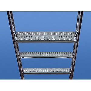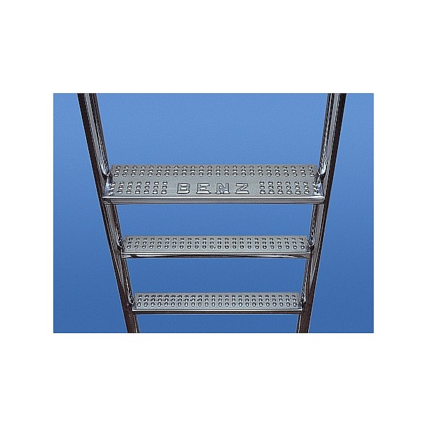 BENZ access steps for height-adjustable lifting floor made of stainless steel (material 1.4301), with ground surface. To be hung on the pool edge in ground sleeves set in concrete. The stairs are adapted to the structural conditions (pool head) and are removable. Height adjustment from -30 cm to -180 cm, mounted on plastic rollers, stair width 100 cm, nubbed steps, 30 cm deep.