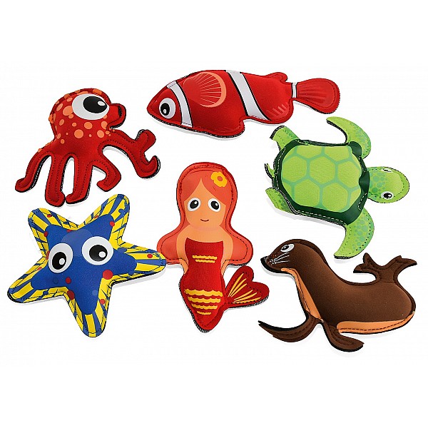 Filled with quartz sand sink the diving animals to the ground. Thanks to the nice design and bright colors are clearly visible. Below and above water you are a varied playing partner. The neoprene material is waterproof and a good grip. Included in the set of 6, a squid, a seal, a starfish, a Meerjungrau, a tortoise and a clown fish. Caution: Use only in shallow water under adult supervision.