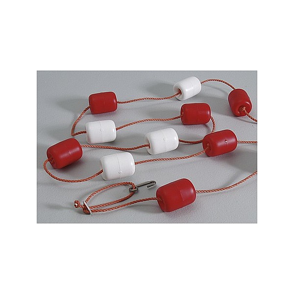 Polypropylene rope (diameter 6 mm) with red and white Hostalenkugeln, assembled. With two hooks made of stainless steel and adjustment for precise length adjustment.