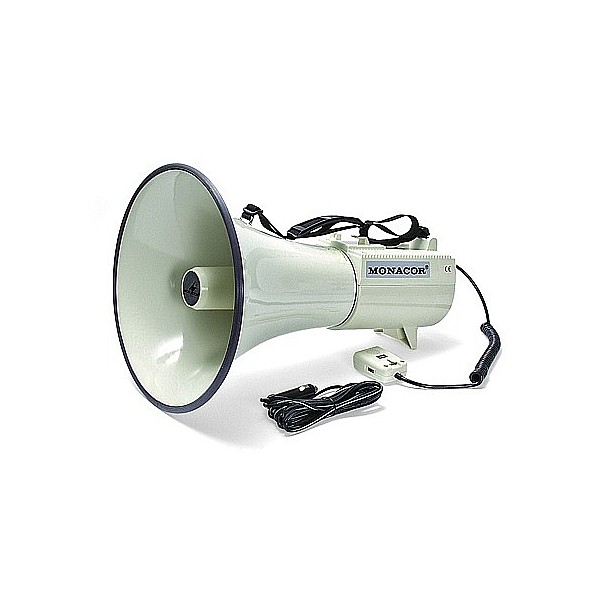 High-Shoulder Megaphone, 45 watts, AUX universal input for MP3 players, or other devices with RCA jack output. Range about 800 m, Siren, switchable, jack for external 12V battery operation (cable included), hand-held microphone with spiral cable, Caps Lock, and volume control. Mean sound pressure 124 dB. With handle and shoulder strap, power: 10 x 1.5 V Mono batteries (LR20). Dimensions: length 505 mm, Ø 350 mm, weight 3.3 kg. Delivery without batteries.