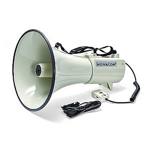 High-Shoulder Megaphone, 45 watts, AUX universal input for MP3 players, or other devices with RCA jack output. Range about 800 m, Siren, switchable, jack for external 12V battery operation (cable included), hand-held microphone with spiral cable, Caps Lock, and volume control.