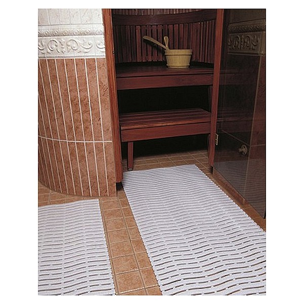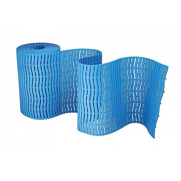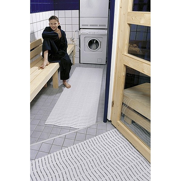This flooring made of colored and recyclable PE plastic is hygienic and reliable protection against fungal infections through the use of antibacterial and pilzverhindernder additives and is resistant to temperatures of minus 40 ° C to the sauna heat. Due to the special Stand construction, a water drainage is guaranteed at all times. It is easy to clean, making it ideal for saunas, solariums, swimming pools and changing rooms. 600mm wide, max. Roll length = 15m.
