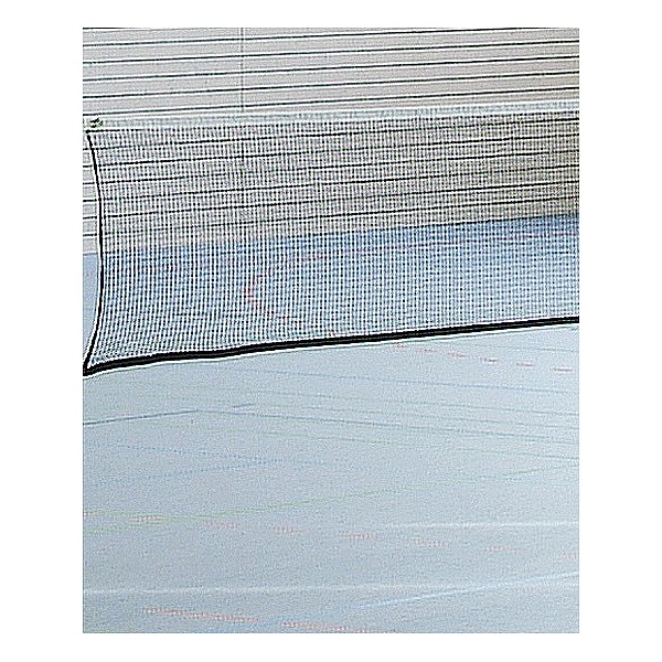Polypropylene 1.2 mm thick, 6.02 m wide, 76 cm high. White mesh ca. 18 mm, 8 m long Kevlar rope. Both sides incorporated polyester rods. mm on top of the net 75 polyester edging (without belt tensioner). DIN EN 1509th