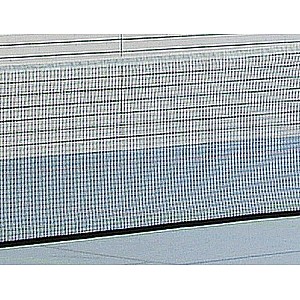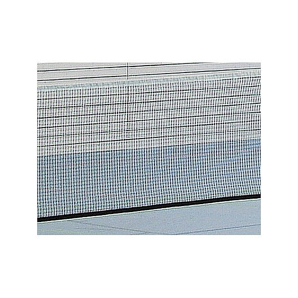 Polypropylene 1.2 mm thick, 6.02 m wide, 76 cm high. White mesh ca. 18 mm, 8 m long Kevlar rope. Both sides incorporated polyester rods. mm on top of the net 75 polyester edging (without belt tensioner). DIN EN 1509th