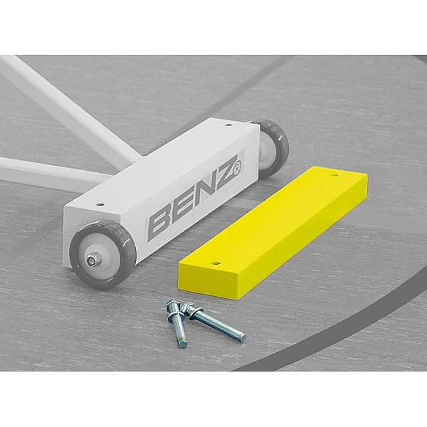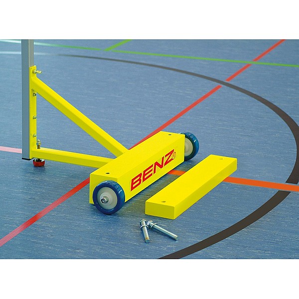 BENZ Badminton double posts with solid, heavy stand made of yellow painted steel. The stand consists of welded steel plates with welded square tubes (45 x 45 mm) to hold the aluminium playing posts (40 x 40 mm), which are also used in the BENZ badminton stand EXKLUSIV. The distance between the posts is 50 cm. The playing posts are equipped with a net edge rod guide in which the matching badminton nets can be threaded. For net tensioning, we recommend a strap tensioner that can be hooked directly into the eyebolt of the post fastening. In combination with 2 BENZ badminton stands EXCLUSIVE, or 2 BENZ badminton stands standard, this double post stand can be used to tension 2 badminton nets next to each other. The 65 kg stand is equipped with two wide plastic castors for easy transport. For transport, simply tip the stand over the posts onto the castors. For a non-slip stand and to protect the ground, the stand is equipped with absorbing plates. Supplied with play posts, without net and without strap tensioners. Specifications: Weight 65 kg Post spacing 50 cm Playing posts aluminium 4 x 4 cm Dimensions base plate (w x d) 50 x 43.8 cm Height without posts 34.8 cm Height ready to play with posts 155.8 cm