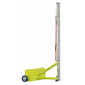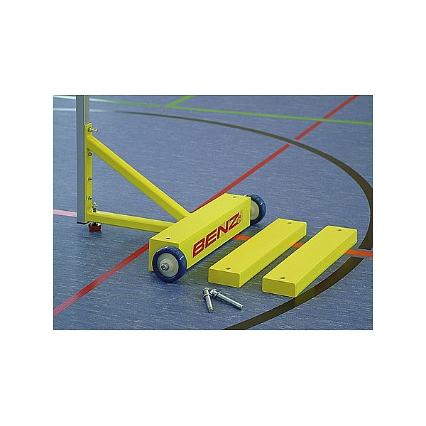 BENZ Badminton double posts with solid, heavy stand made of yellow painted steel. The stand consists of welded steel plates with welded square tubes (45 x 45 mm) to hold the aluminium playing posts (40 x 40 mm), which are also used in the BENZ badminton stand EXKLUSIV. The distance between the posts is 50 cm. The playing posts are equipped with a net edge rod guide in which the matching badminton nets can be threaded. For net tensioning, we recommend a strap tensioner that can be hooked directly into the eyebolt of the post fastening. In combination with 2 BENZ badminton stands EXCLUSIVE, or 2 BENZ badminton stands standard, this double post stand can be used to tension 2 badminton nets next to each other. The 65 kg stand is equipped with two wide plastic castors for easy transport. For transport, simply tip the stand over the posts onto the castors. For a non-slip stand and to protect the ground, the stand is equipped with absorbing plates. Supplied with play posts, without net and without strap tensioners. Specifications: Weight 65 kg Post spacing 50 cm Playing posts aluminium 4 x 4 cm Dimensions base plate (w x d) 50 x 43.8 cm Height without posts 34.8 cm Height ready to play with posts 155.8 cm