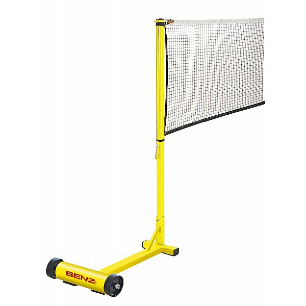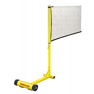 Badminton net stand for freestanding installation in sports halls. Steel construction with a painted finish ensures high stability and durability for regular use. Two integrated transport wheels allow flexible positioning and transport without additional tools. Rubberized bases protect sensitive indoor floors. Disassemblable design for easy storage in confined spaces.
