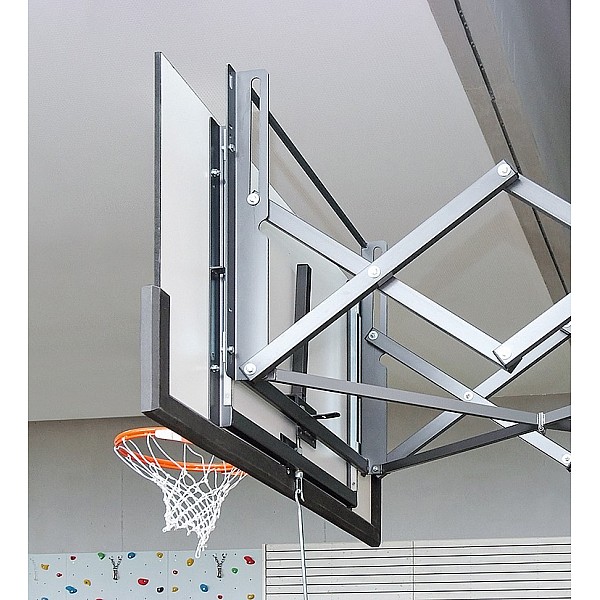 Basketball ceiling scaffold according to pulled up to 7.00 m ceiling height, tubular steel frame with hinges to the back of the hall ceiling. The steel pipes are phosphated and coated with two-component lacquer DD. issued. No engine, fall protection and backboard.