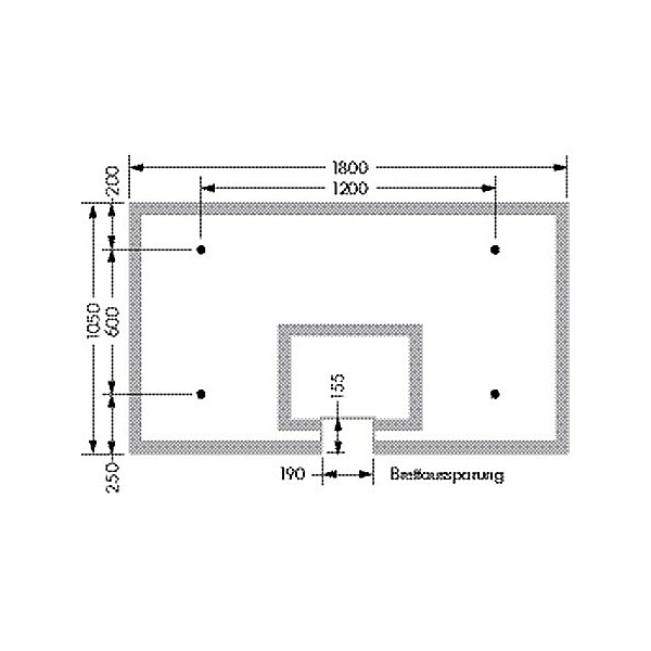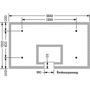 For DIN and FIBA ??system, 105 x 180 cm, 12 mm thick white marking according DBB / FIBA ??regulation. With glass cutting for basket, holes for fasteners and fastening kit.