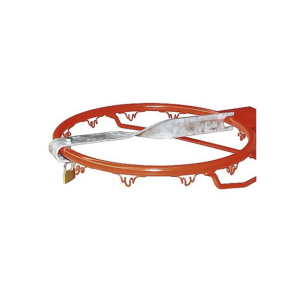Heavy duty, galvanized. The massive bar is simply pushed onto the basketball hoop, secured with a bolt and completed with a safety lock. Prevents temporarily as during rest periods or overnight in residential areas recording on basketball equipment.