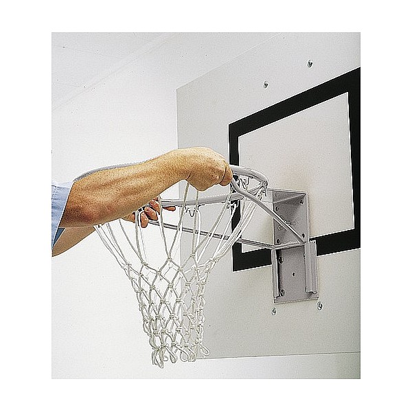 Basketball basket, removable, hot dip galvanized, by international regulations, with safety net hooks, incl. Retaining plate with lateral guide in which the basket is pushed in, the locking screw against unintentional lifting, incl. Fastening screws. No power.