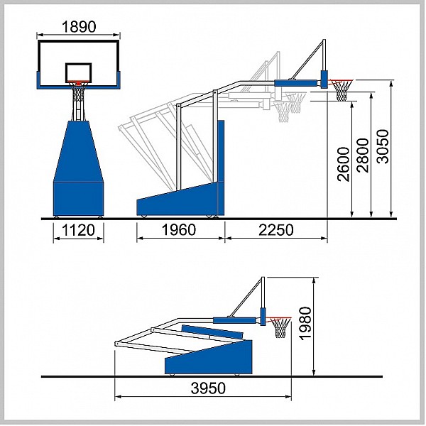 (FIBA LEVEL 3). Projection 165 cm. With glass target board, 105 x 180 cm, in the metal frame with blue upholstery. 6 wheels, 2x front, 4x rear, Ø 200 mm. Lockable mechanism in the rest position. Complete blue upholstery of the base frame. Improved security systems for a quiet game position.