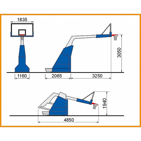 (FIBA LEVEL 3). Projection 165 cm. With glass target board, 105 x 180 cm, in the metal frame with blue upholstery. 6 wheels, 2x front, 4x rear, Ø 200 mm. Lockable mechanism in the rest position. Complete blue upholstery of the base frame. Improved security systems for a quiet game position.