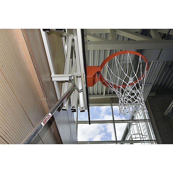 The laterally swivelling BENZ exercise system is attached directly to the wall with a projection of 58 cm. The system is designed for a board measuring 90 x 120 cm. The galvanised steel frame is equipped with a threaded spindle for height adjustment.This allows the basket to be adjusted to a height of 2.65 m to 3.05 m. Delivery is ex works, without board, basket and net.
