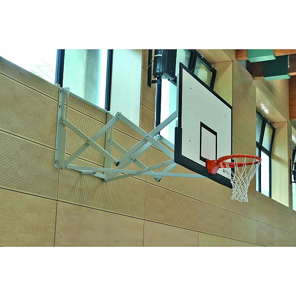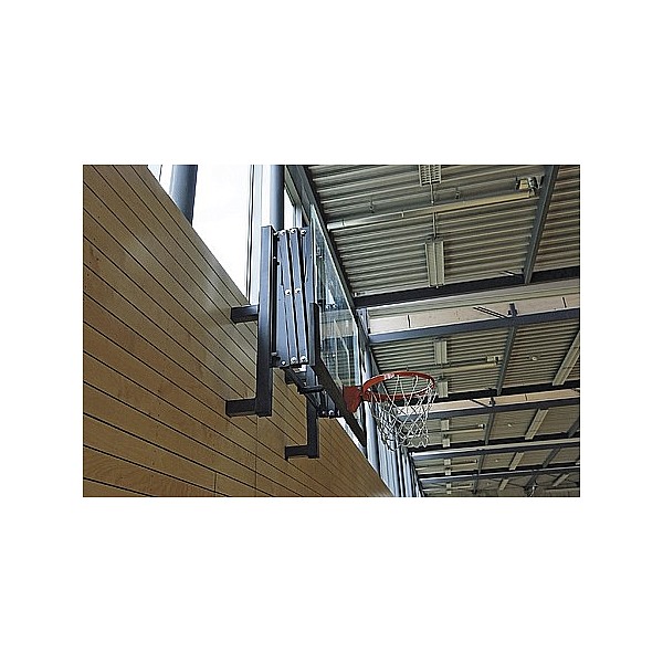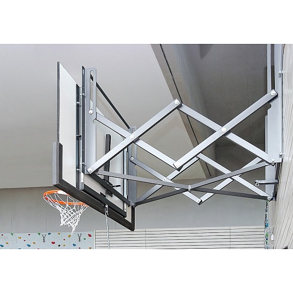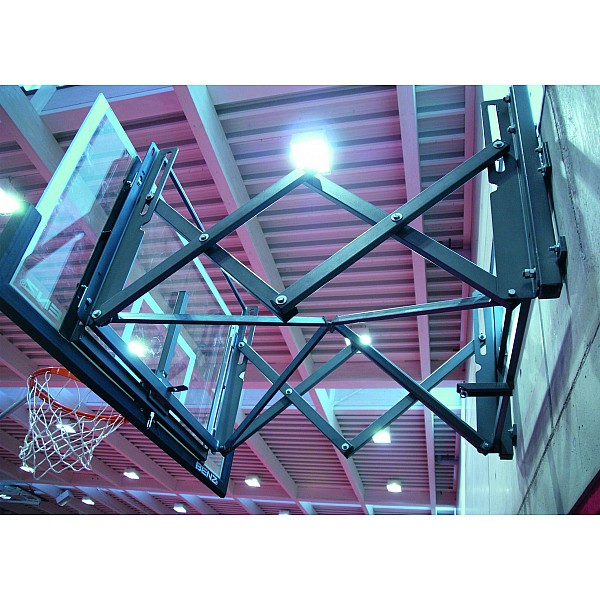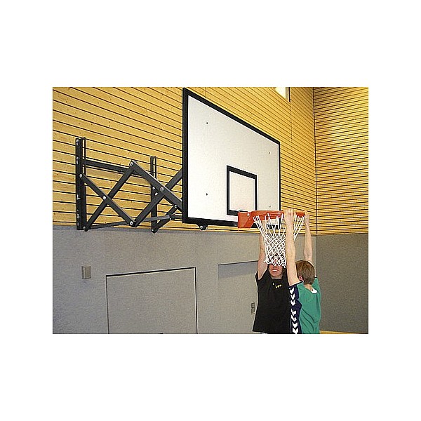 Basketball wall rack with new support link. The system is centrally driven back from extended position against the wall. Optimum optical and architectural integration, since no projecting parts in both positions. Two novel locking lever which are pivotally coupled via a hinge connection allowing to date not reached stability. Standard finish: BENZ Green