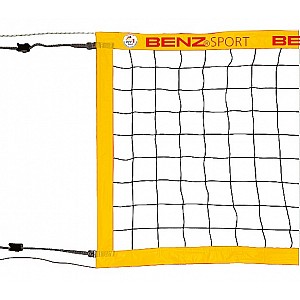 Volleyball net 8.5 x 1.0 m. Mesh width 10 cm, 3 mm polyester, knotless, black. M above with Kevlar rope 10.7, below 4 mm thick tensioning cable, fiber optic polyester edge reinforcement, 4-point suspension and 4 tensioning cords with snap closure. 1 Round 80 mm yellow edging.