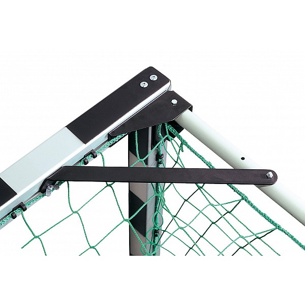 Reinforcement bracket gives the door frame an enormous stability. All screw connections are equipped with self-fuses. The net supports are made of thick steel pipe, hence the gate receives a unique status. The net is suspended freely between the net supports. Each net support is provided with the proven mounting tabs? now taken over in this design in the DIN. Complete with pipe end caps and plastic net hooks for easy installation. For halls. Varnished and foldable net supports, four bottom flaps. According to DIN EN 749, IHF-certified. No power.