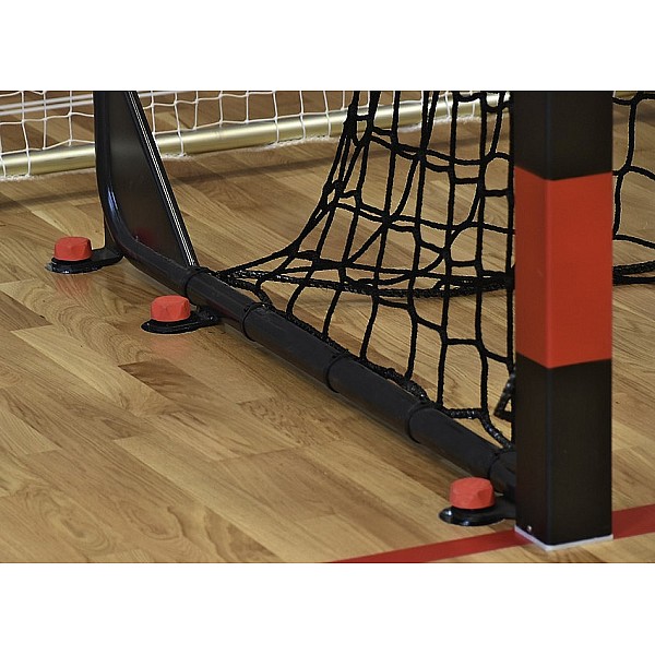 Reinforcement bracket gives the door frame an enormous stability. All screw connections are equipped with self-fuses. The net supports are made of thick steel pipe, hence the gate receives a unique status. The net is suspended freely between the net supports. Each net support is provided with the proven mounting tabs? now taken over in this design in the DIN. Complete with pipe end caps and plastic net hooks for easy installation. For halls. Varnished and foldable net supports, four bottom flaps. According to DIN EN 749, IHF-certified. No power.