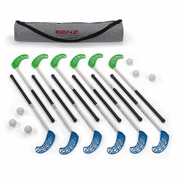 Unihockey stick set "Falcon" consisting of: 6 black/white/blue and 6 black/white/green sticks, 6 balls and stick bag, shaft length 80 cm, Ø 2.3 cm, reinforced with fiberglass, suitable for school and recreational sports, for body heights of 141-150 cm