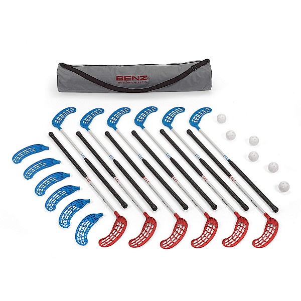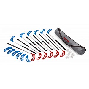 Unihockey stick set "Attack" consisting of: 6 black/white/blue and 6 black/white/red sticks for right-handers , as well as 6 additional quick-change trowels left-handers 6 balls and stick bag, shaft length 90 cm, Ø 2.3 cm, for heights of 161 - 175 cm