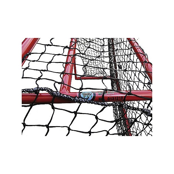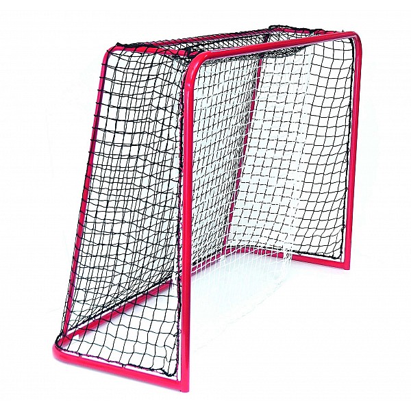 Mini field hockey goal, (w x h x d) 90 x 60 x 45 cm. This sturdy field hockey goal is delivered pre-assembled and is ready to play immediately after unfolding the net hoops. The complete goal frame is made of 28 mm thick, powder-coated, weatherproof steel and is equipped with floor protectors. The goal can be used on any surface and has a high stability due to the locking mechanism of the net hoops. The delivery includes an easy-to-mount net made of 2 mm thick polyester with a mesh size of 45 mm. In the lower area, the net also has a black PVC protective strip.