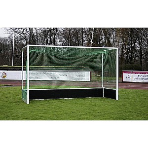 Mini field hockey goal, (w x h x d) 90 x 60 x 45 cm. This sturdy field hockey goal is delivered pre-assembled and is ready to play immediately after unfolding the net hoops. The complete goal frame is made of 28 mm thick, powder-coated, weatherproof steel and is equipped with floor protectors. The goal can be used on any surface and has a high stability due to the locking mechanism of the net hoops. The delivery includes an easy-to-mount net made of 2 mm thick polyester with a mesh size of 45 mm. In the lower area, the net also has a black PVC protective strip.