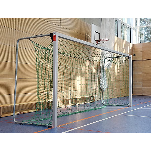 The transportable BENZ youth soccer goal 5 x 2 m, goal depth 1.25 m, with a bolted goal frame made of matt anodized aluminum special profile and foldable net hoops made of strong steel tube, is available in 2 versions. An indoor version with painted net hoops and an outdoor version with galvanized net hoops. The net is freely suspended between the net hoops. Each net hoop is equipped with the proven fastening straps to secure it to the ground. Supplied complete with tube end caps and plastic net hooks for easy net assembly. According to DIN EN 749. TÜV tested by TÜV AUSTRIA. Delivery disassembled in cardboard box, without net and without assembly!