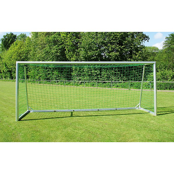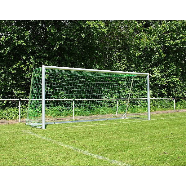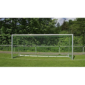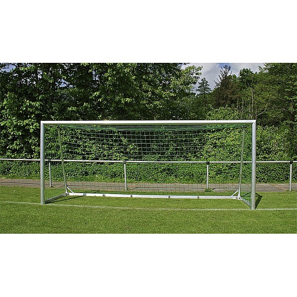 Fully welded youth soccer goal 5.0 x 2.0 m made of high quality, multi-reinforced aluminum profiles (10 x 12 cm), bottom frame (8 x 6 cm). Net depth top 80 cm, bottom 150 cm. Including carrying handles welded on both sides for easy transport and device for ground anchoring. Welded corner connectors between floor frame and net hoop provide additional stability. Integrated safety net hooks for quick and easy net attachment. This goal complies with current FIFA and DFB requirements, as well as applicable safety regulations. Delivery includes net hooks and border rope, without net.
