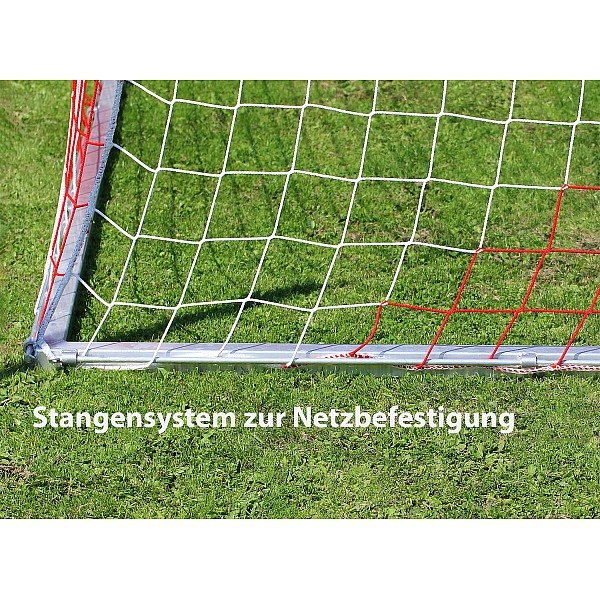 Aluminum soccer goal 7,32 x 2,44 m, fully welded and silver anodized, with free net suspension. According to FIFA-DFB-regulations and DIN-EN 748. Made of especially profiled aluminum profile 100 x 120 mm, with multiple internal stiffening and double groove, in which the net holders are concealed and injury-neutral. The free net suspension, for different net depths, consists of 2 stable tensioning posts in ground sockets, covers and tensioning ropes. The delivery takes place without net and without ground frame, including ground sockets, covers and net holders.